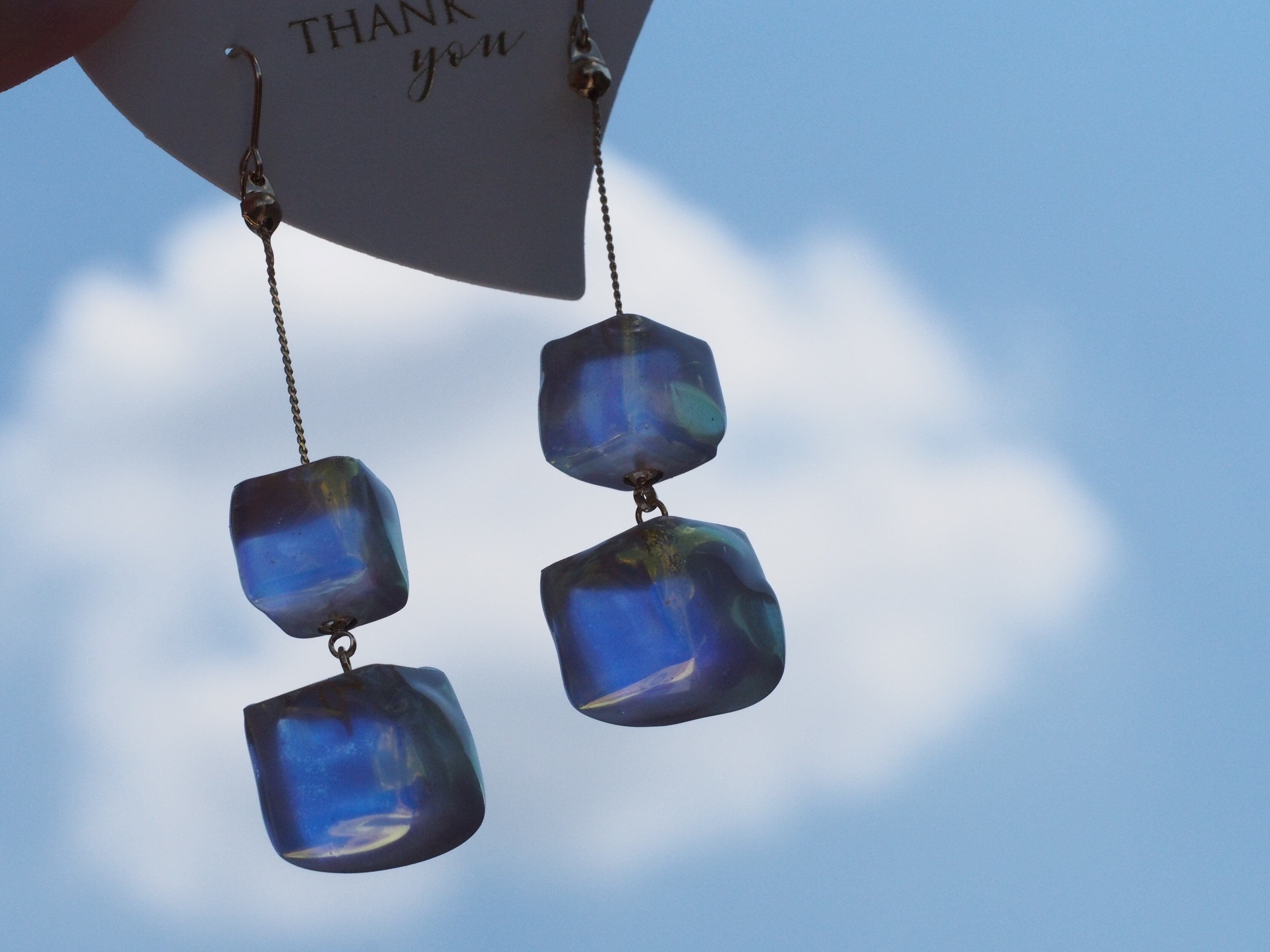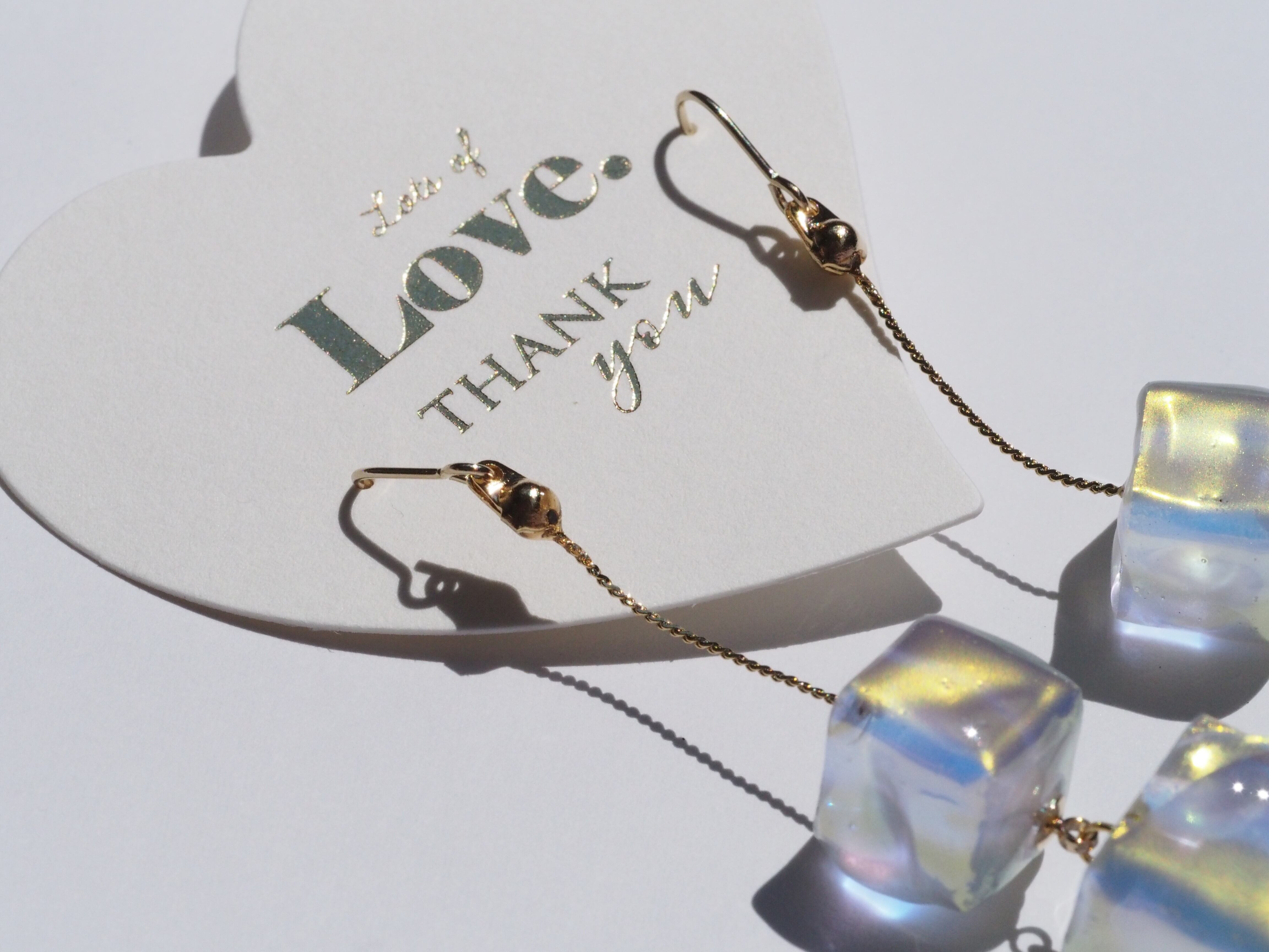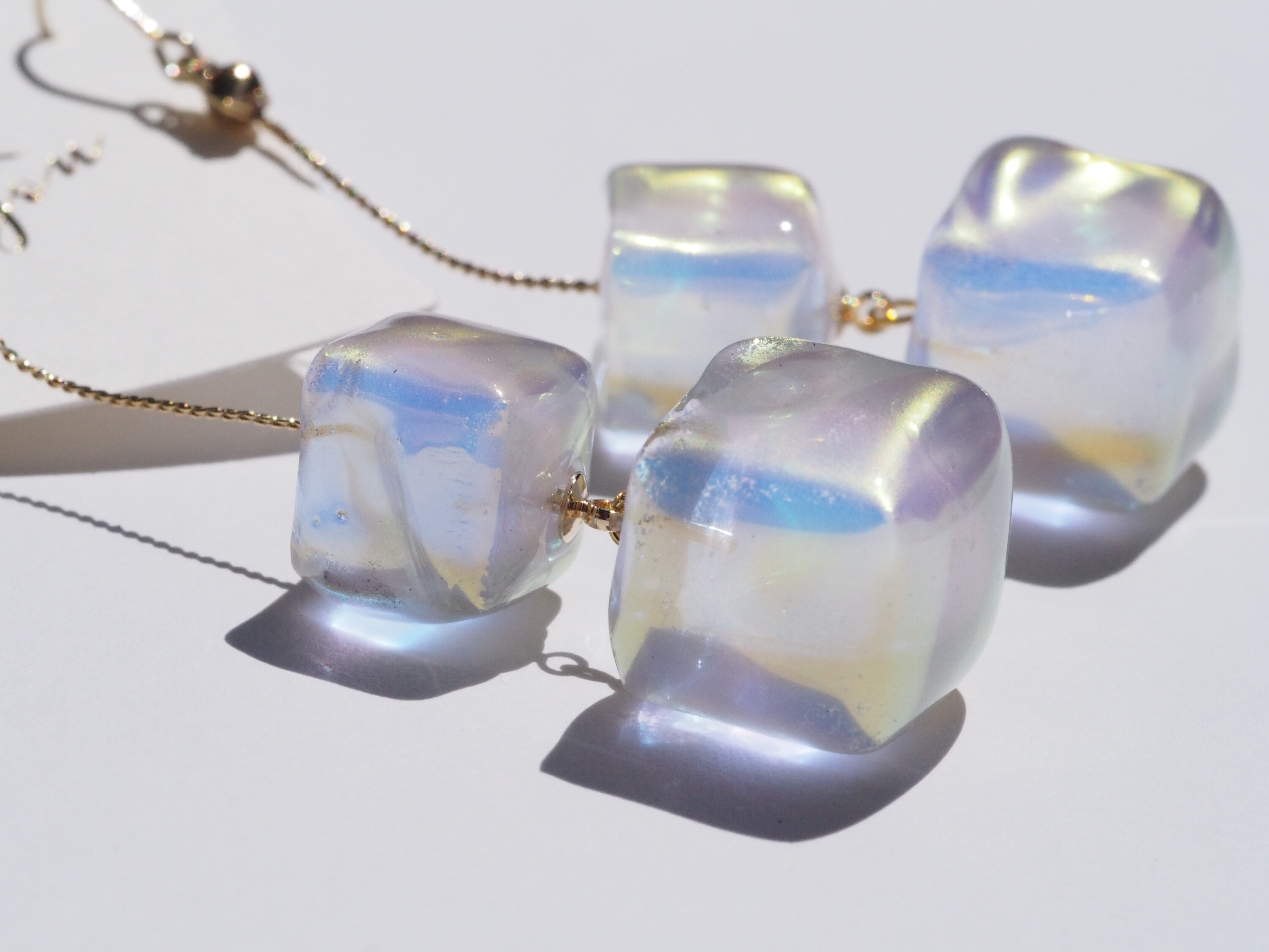 まるで本物の氷のようなとろみ感を再現したピアス・イヤリングです。色はオーロラでキンとした冷え感。これからの季節、耳元にこんなアイスピアスはいかがですか?