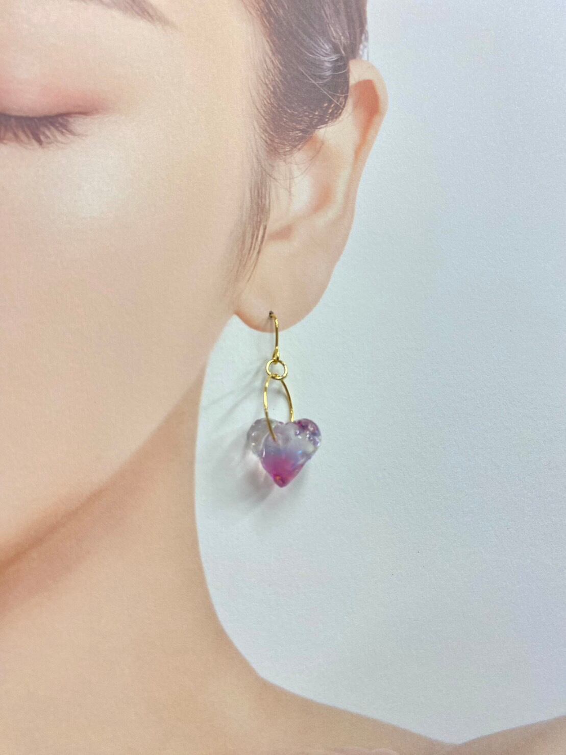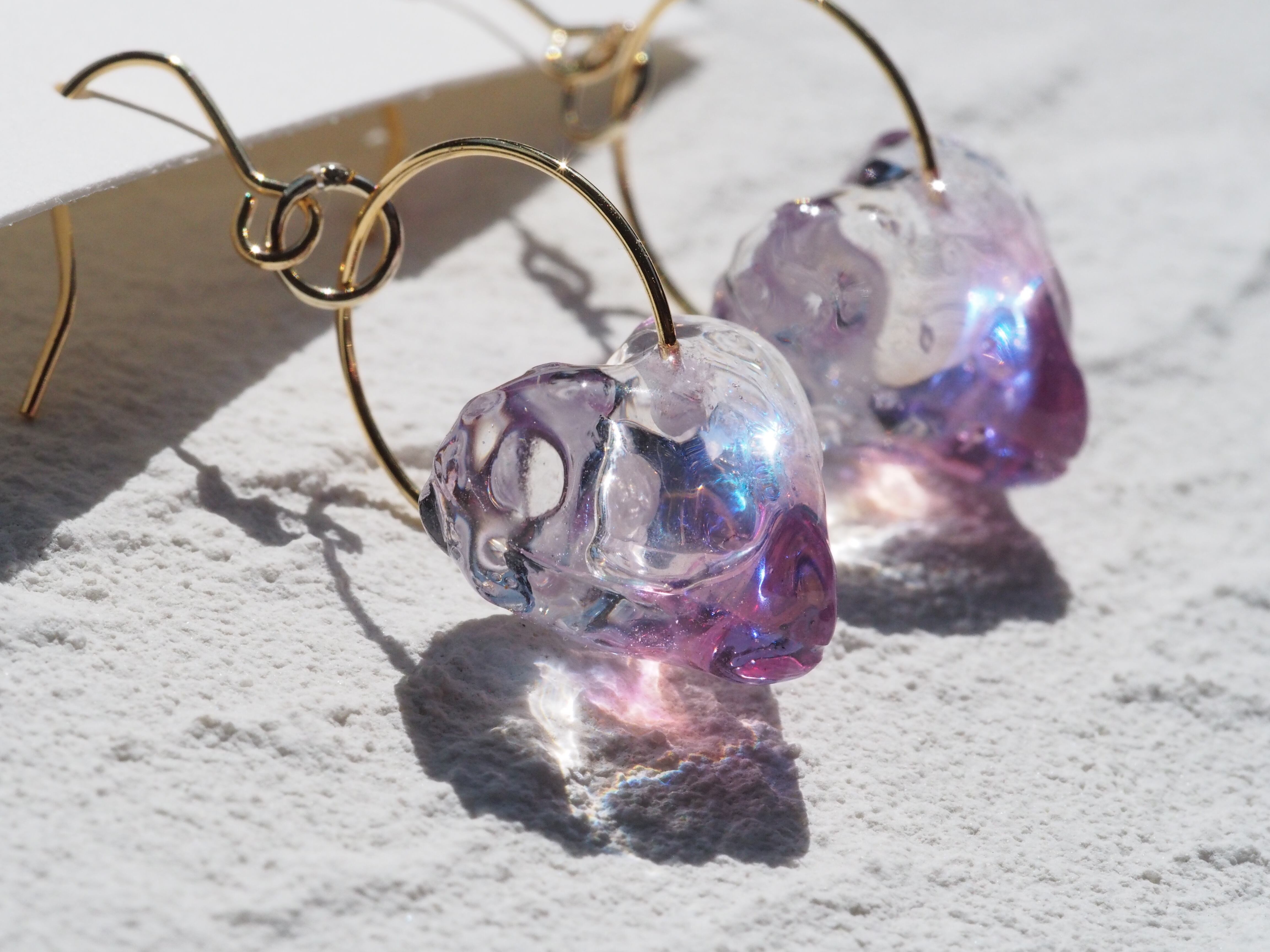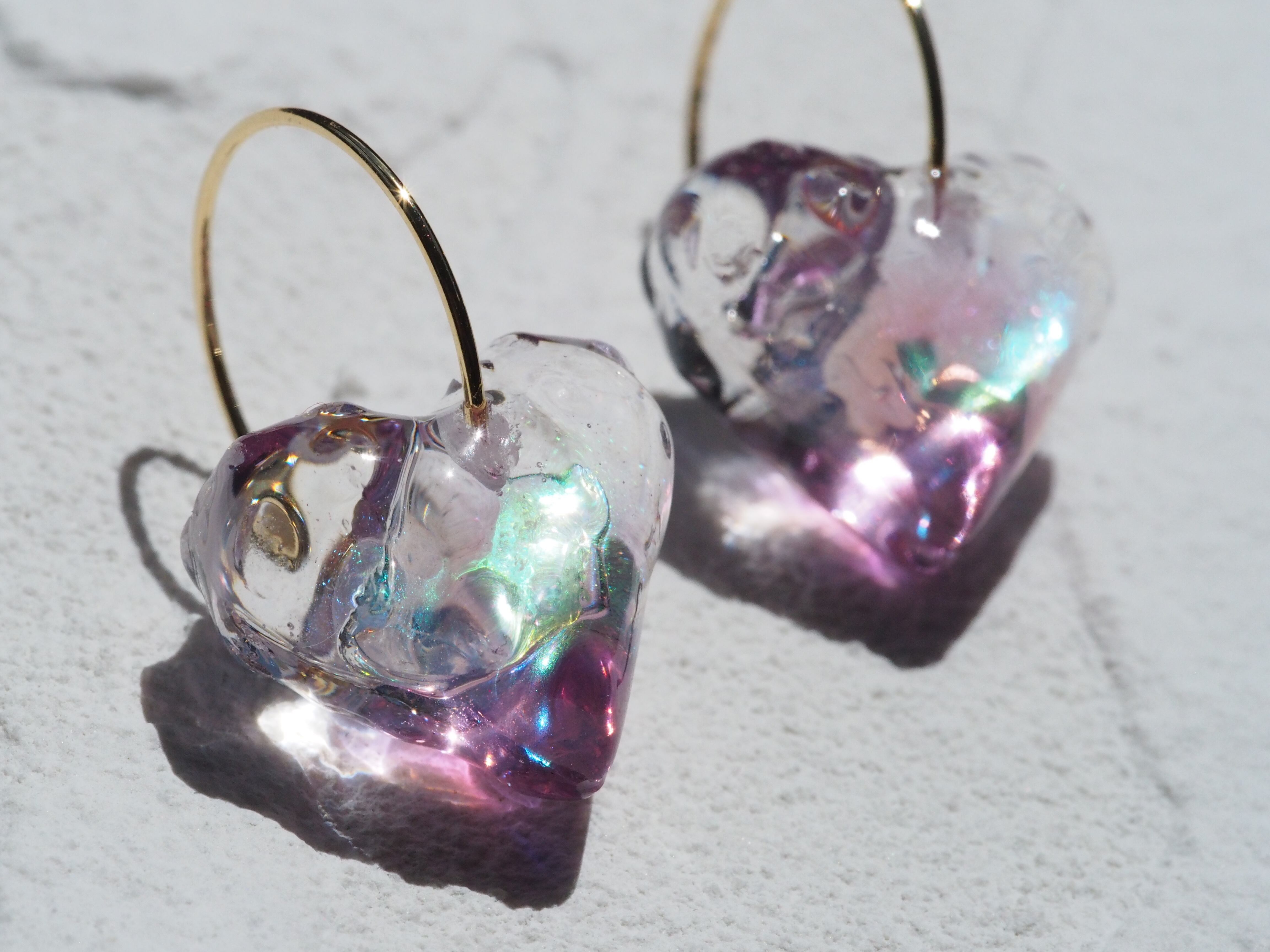 「秘めた想い」を表現し、深みのあるローズピンクを中に閉じ込めました。下から上に向かってふんわりとオーロラをかけているので様々な光の色を楽しめます。表面は手作業でポコポコとした質感に。光を乱反射しまるで本物の水面のようです。樹脂製ですのでとても軽く耳が疲れません。