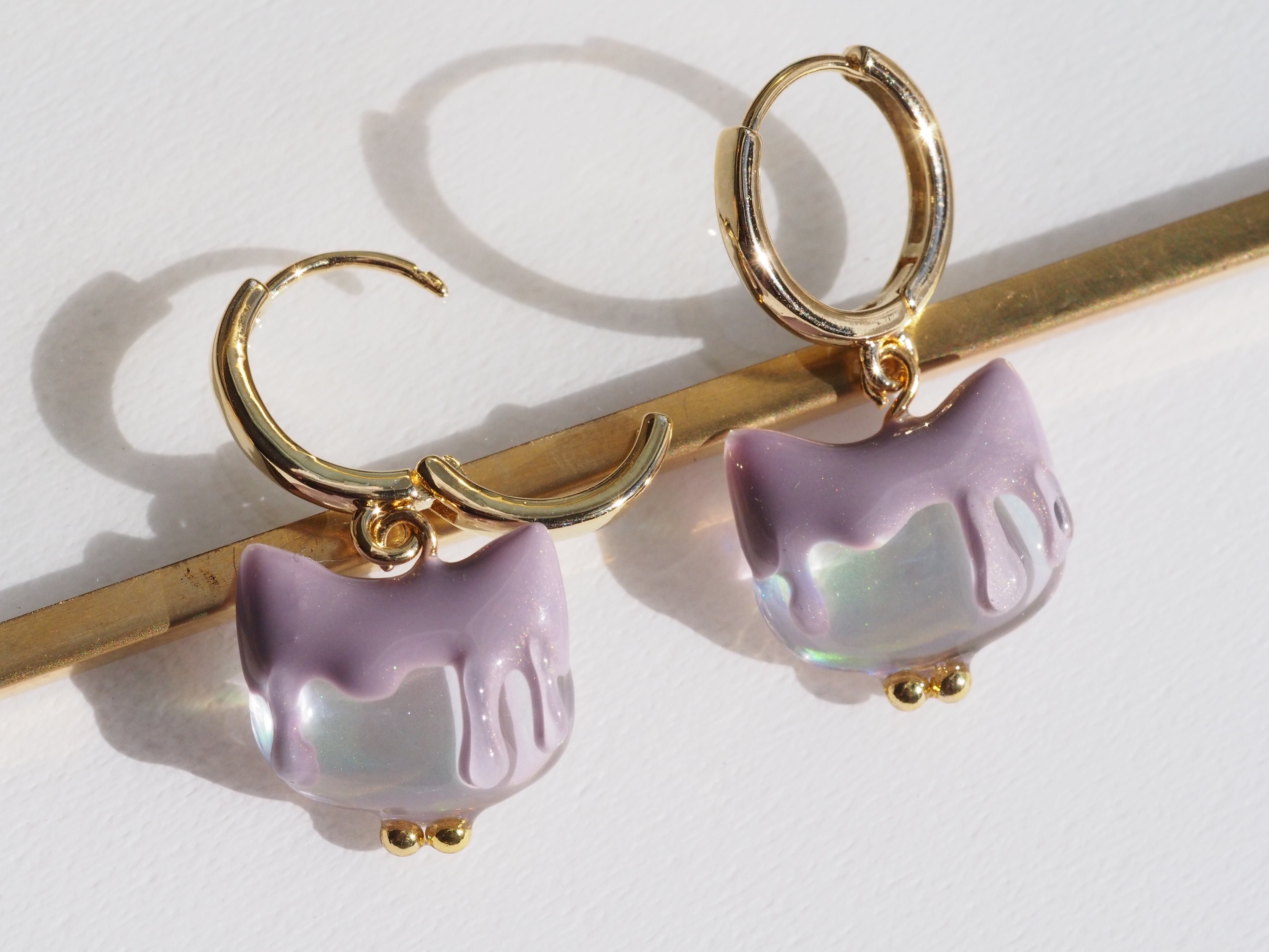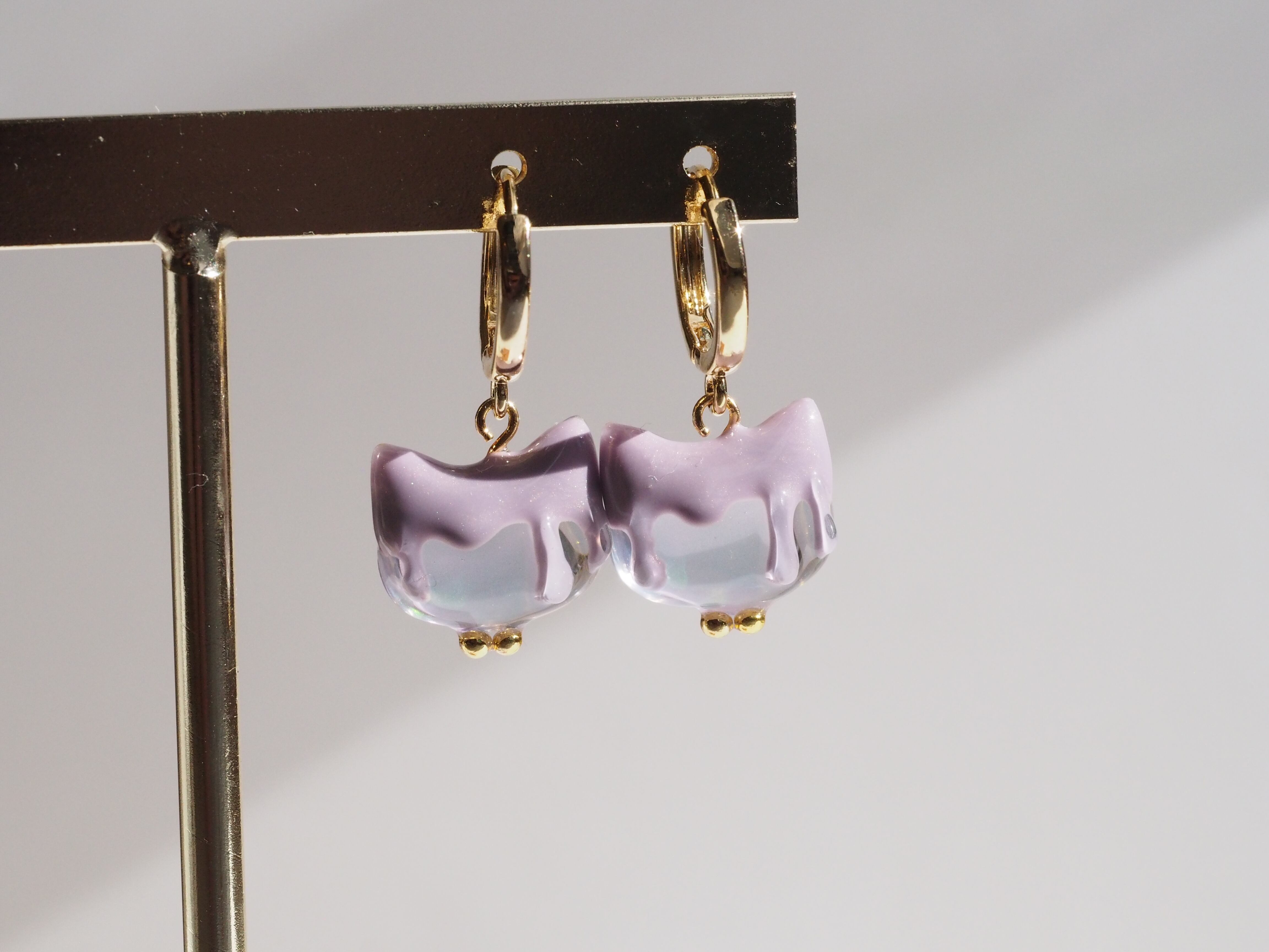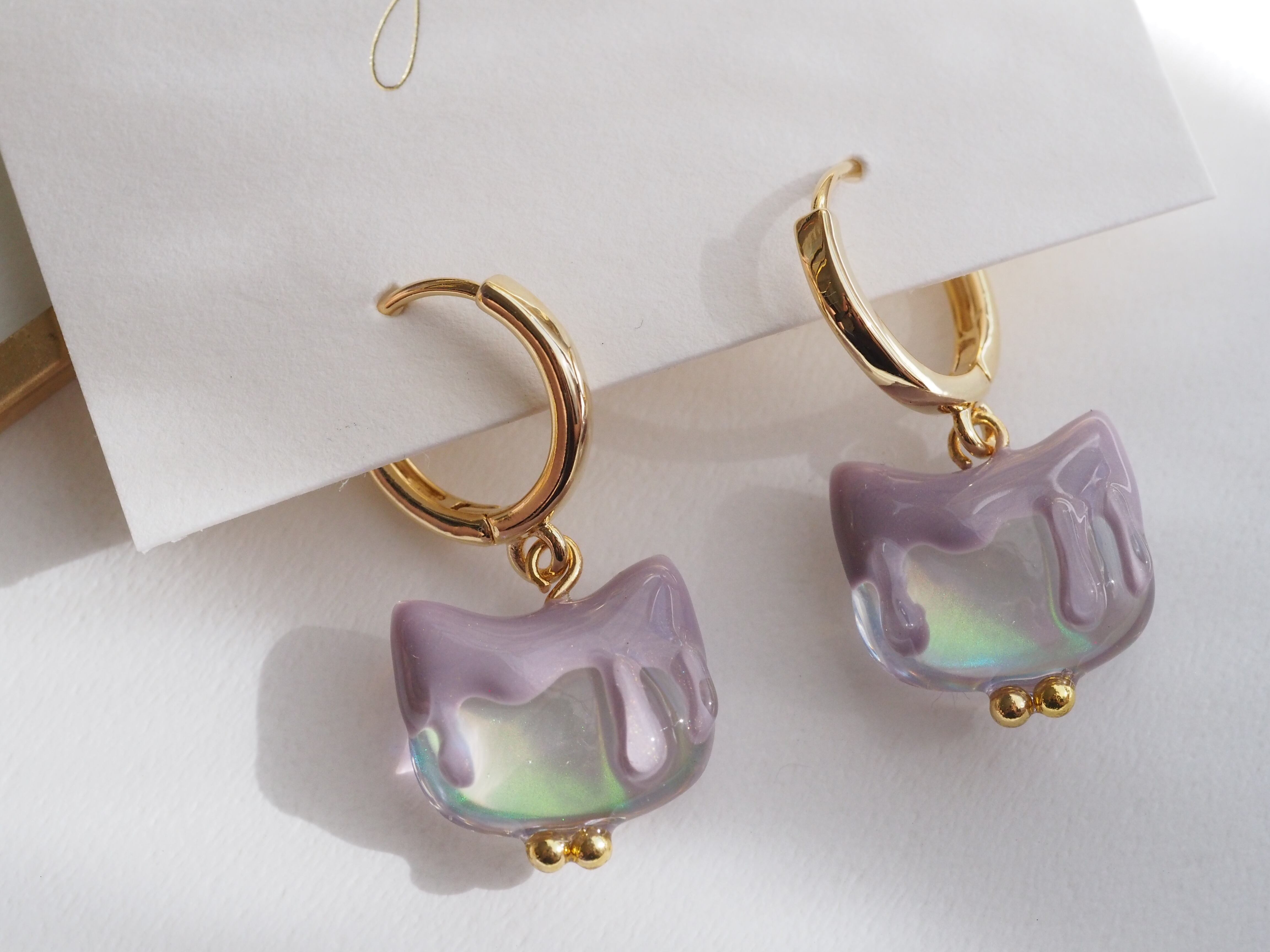とろ~んと溶けたようなフォルムが愛らしいネコピアス・イヤリングです。くすんだ色味のパープルカラーなので肌馴染もよく、超微細なラメが上品さもプラス。中にはふんわりとオーロラも仕込んであるのでどの角度からも美しく後ろ姿もぬかりはありません。