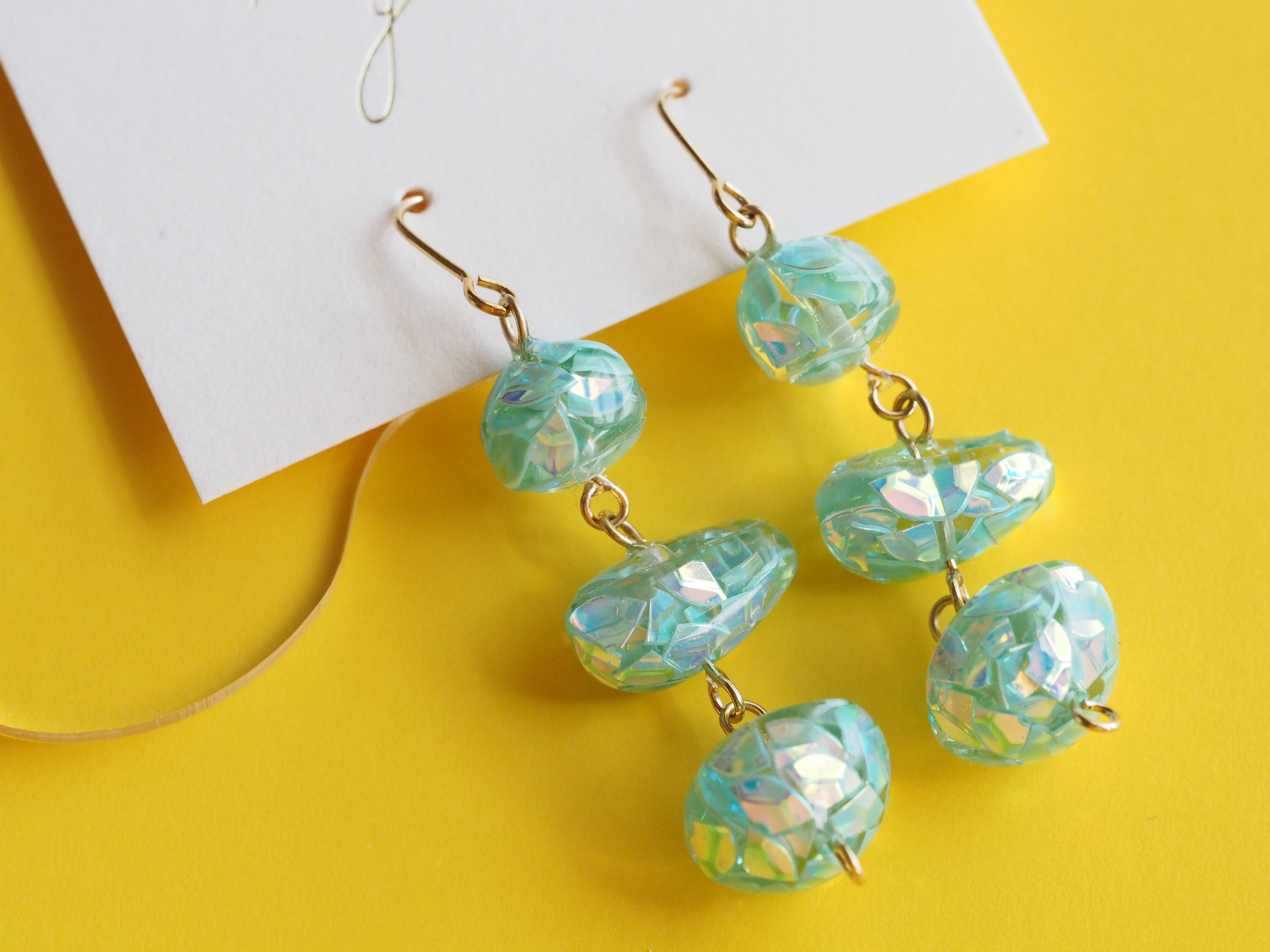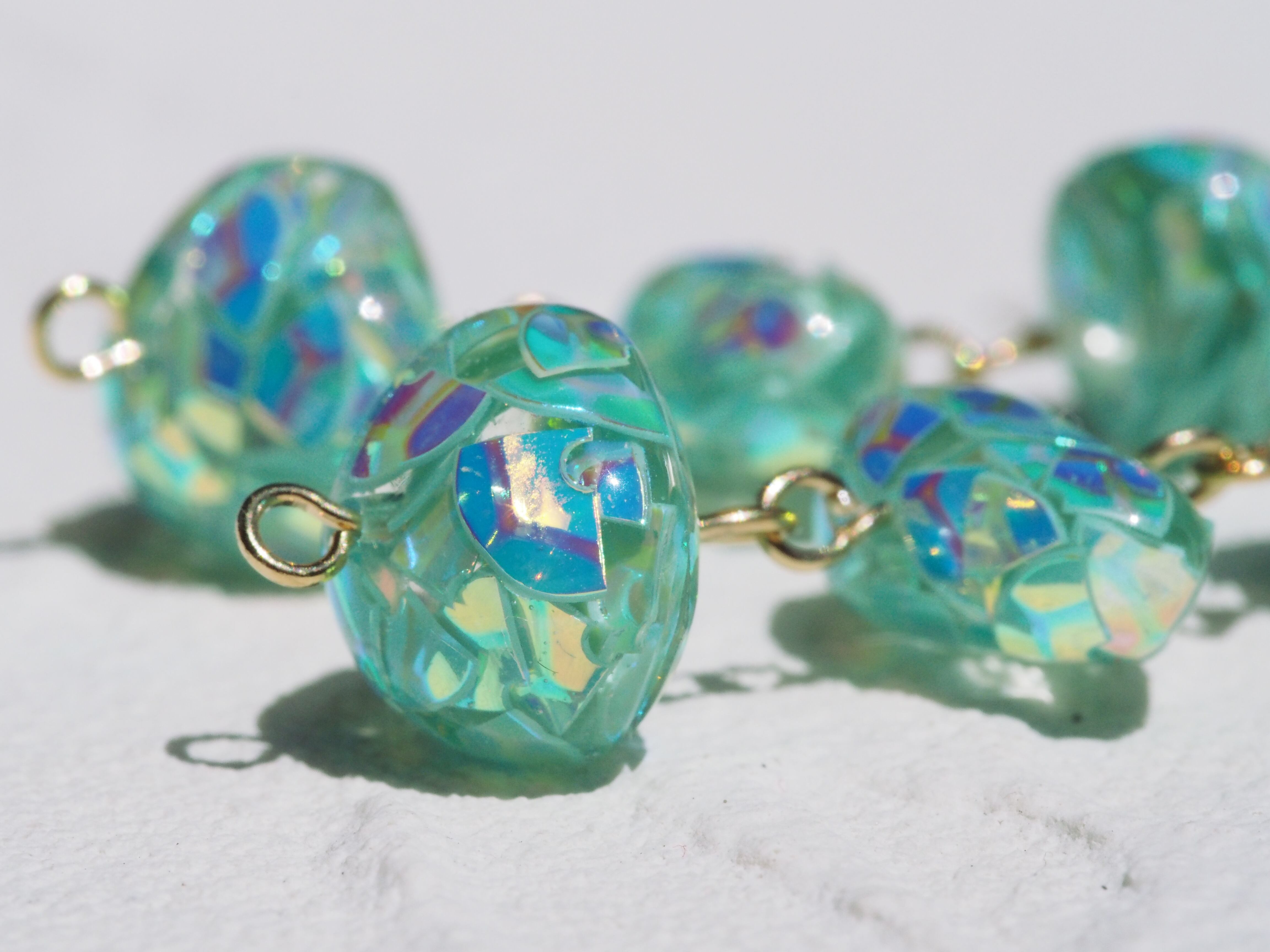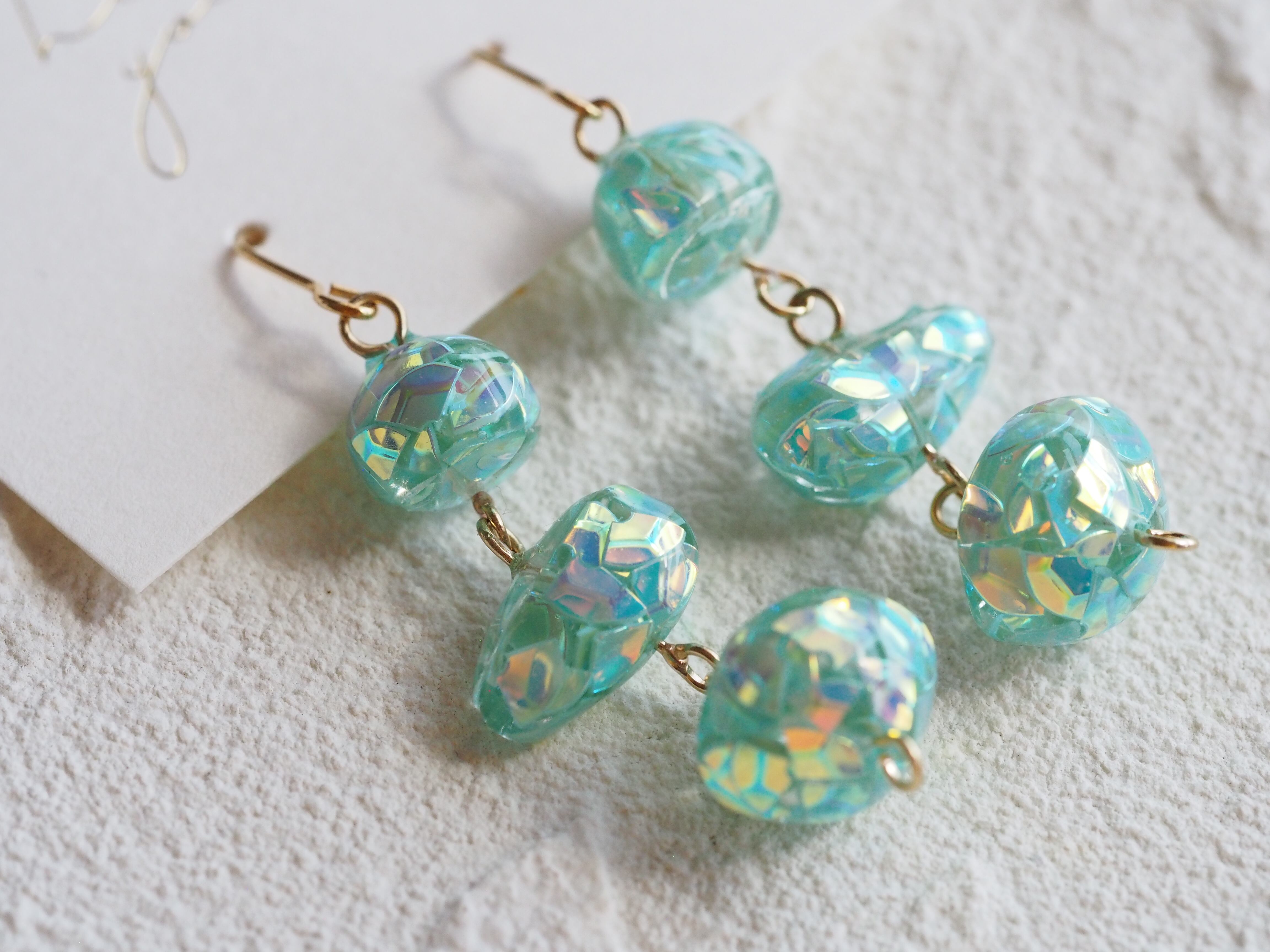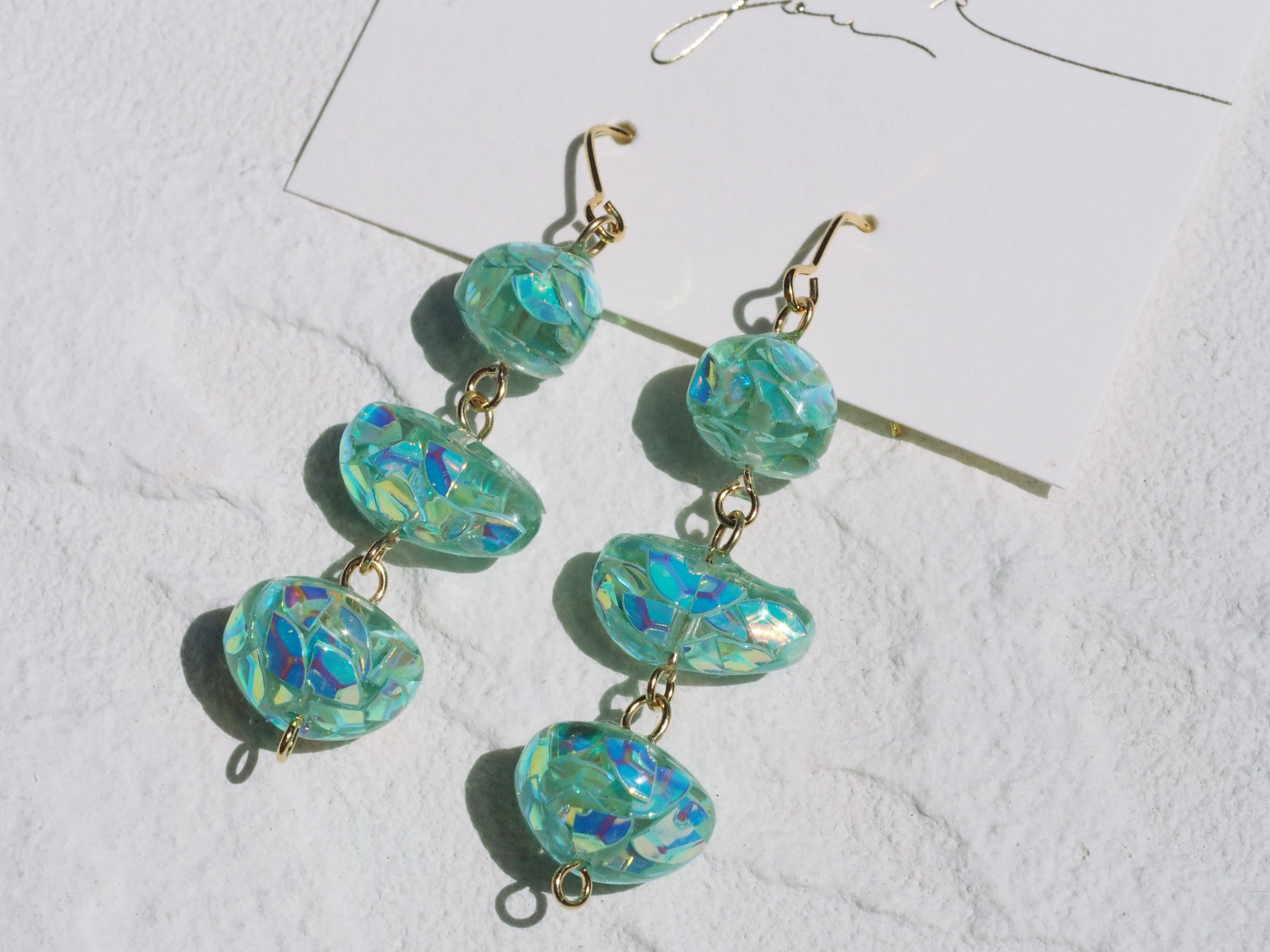 エメラルドグリーンのかけらを敷きつめ、まるでモザイクタイルのような輝きを放つピアス・イヤリングです。それぞれ大きさの違うコロンとした石ころのようなフォルムのパーツを繋げゆらゆらと揺れる様をお楽しみいただけます。