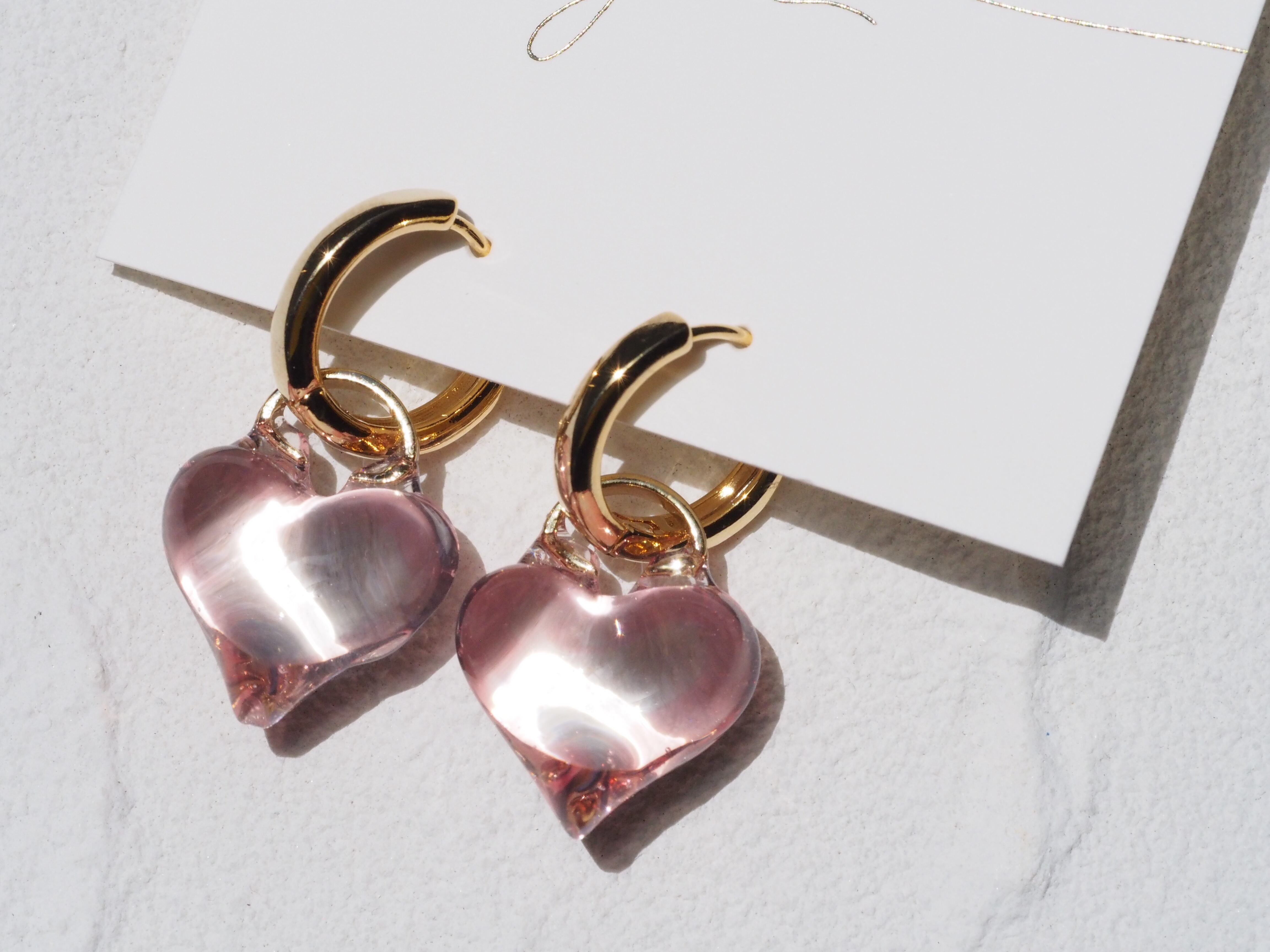 ピンクレッドでふちどりをしたクリア感たっぷりのハートピアス・イヤリングです。肌馴染みの良いカラーでコーディネートやメイクの邪魔をしません。中央部分は色付けがされておらず透け感たっぷりなので可愛くなりすぎません。
